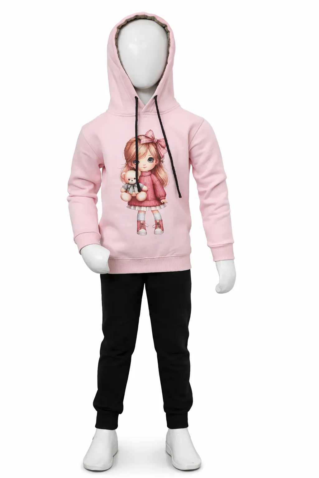 Girls Pink Winter Hoodie & Jogger Set – Cute Doll Print