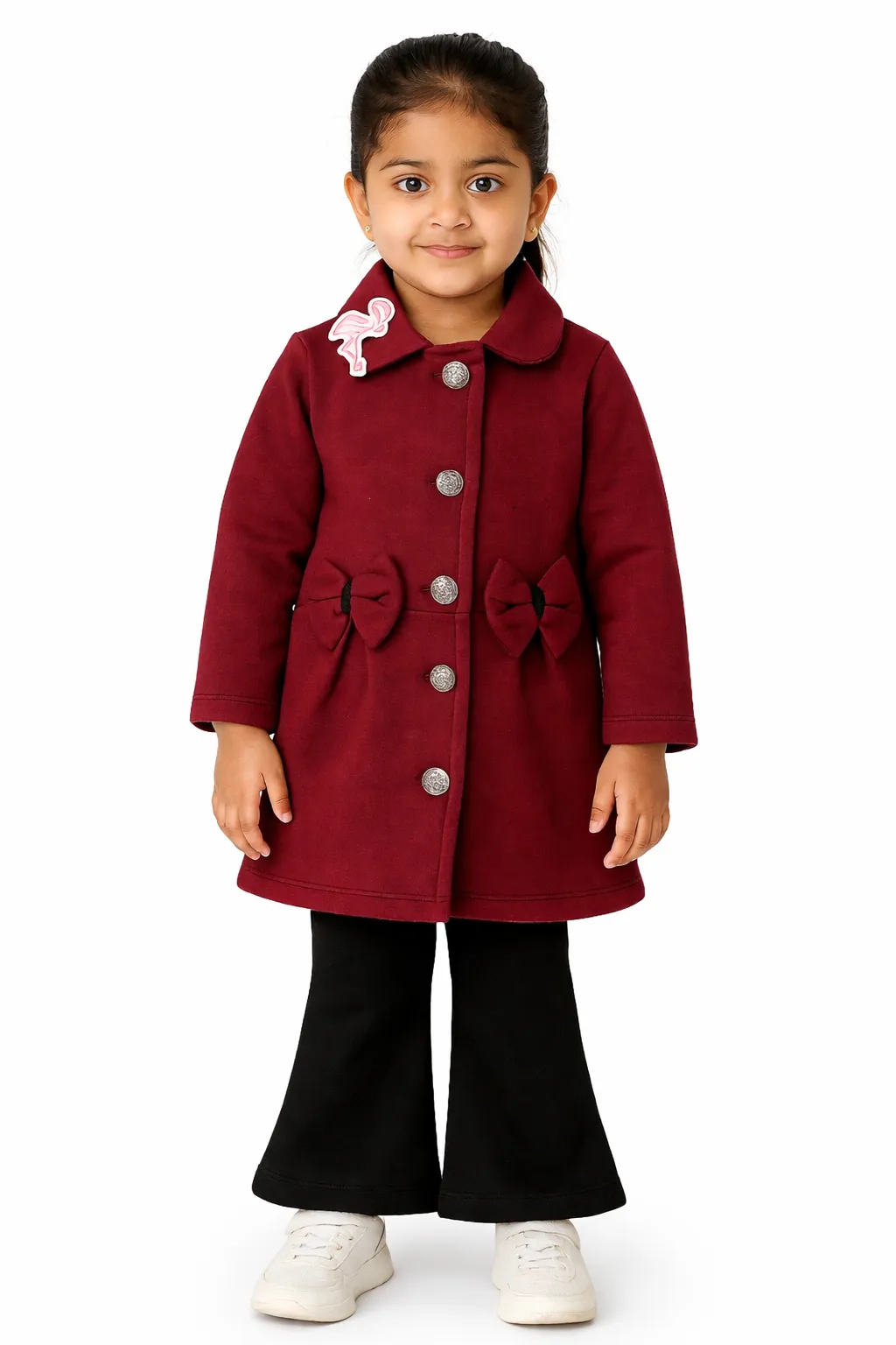 Girls Burgundy Winter Coat with Bow Detail – Elegant Kids Long Jacket
