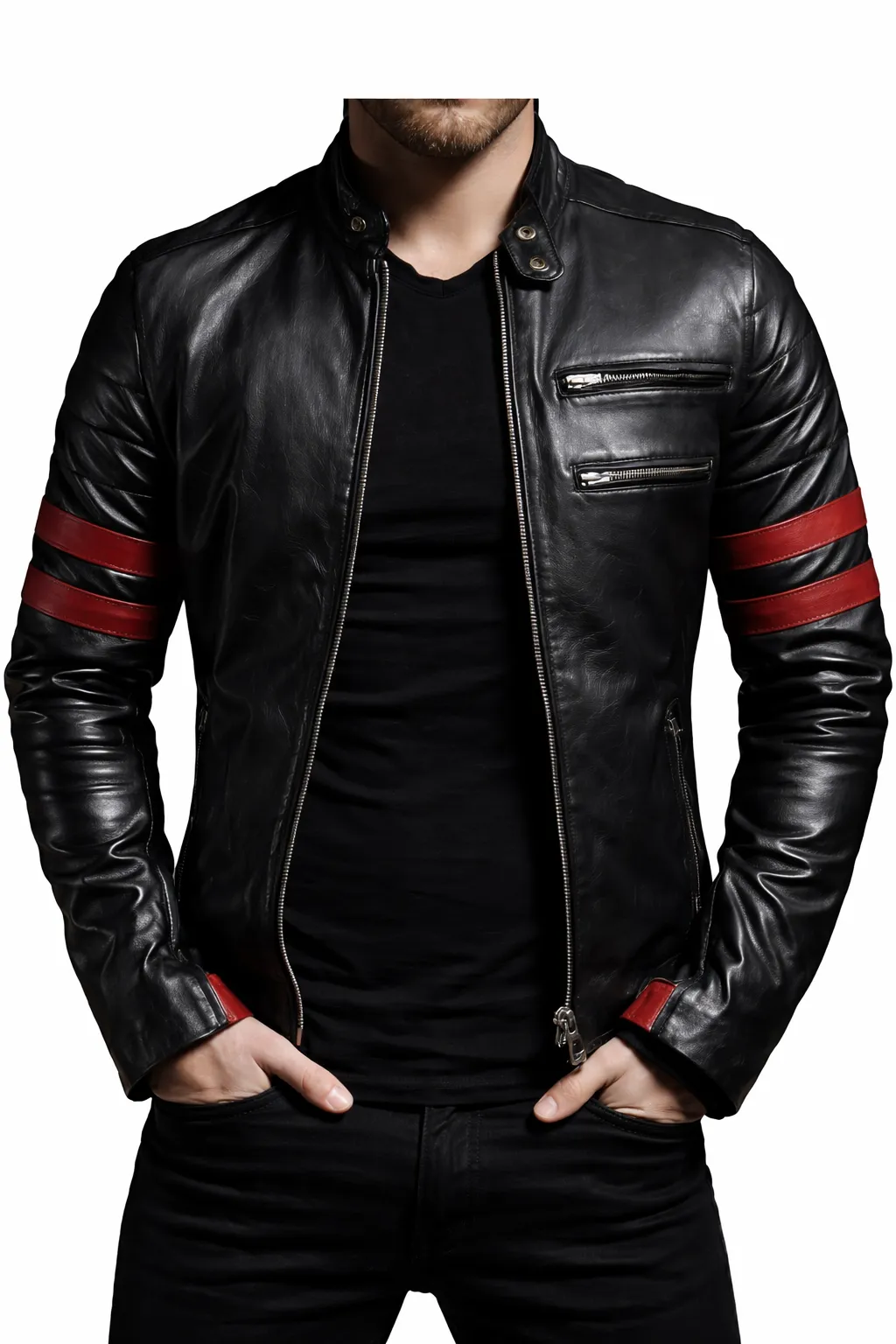 Men’s Black Biker Leather Jacket – Red Stripe Edition