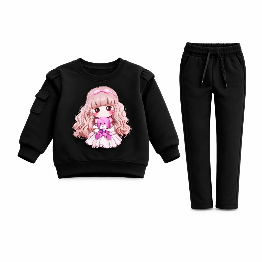 Girls Black Hoodie Tracksuit Set – Cute Doll Print Outfit